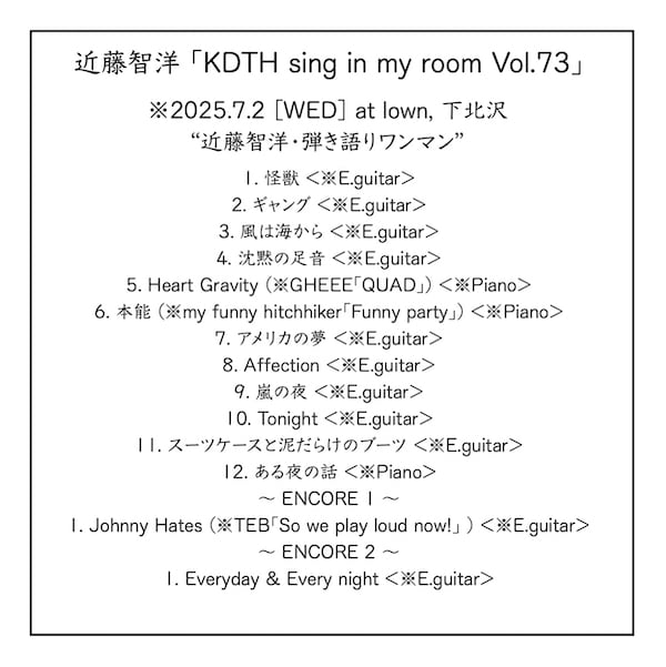 2025/7/2、下北沢ラウンでの近藤智洋、ワンマンのライヴ音源です(カバー曲以外15曲)。