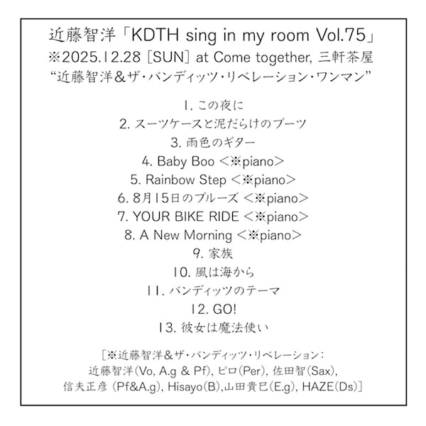 2025/12/28、三軒茶屋Come Togetherでの近藤智洋&ザ・バンディッツ・リベレーション・ワンマンのライヴ音源(13曲セレクト)です。